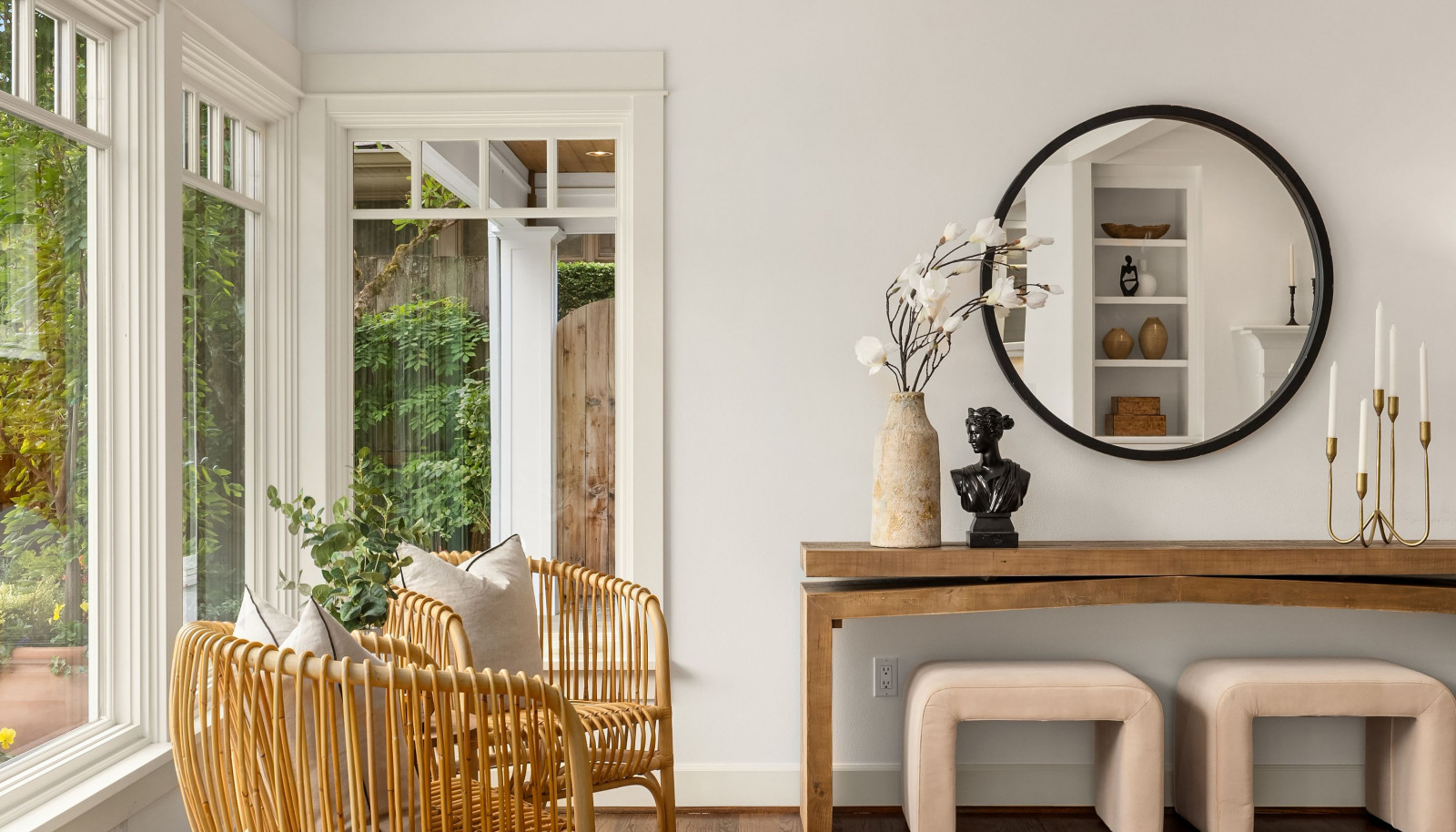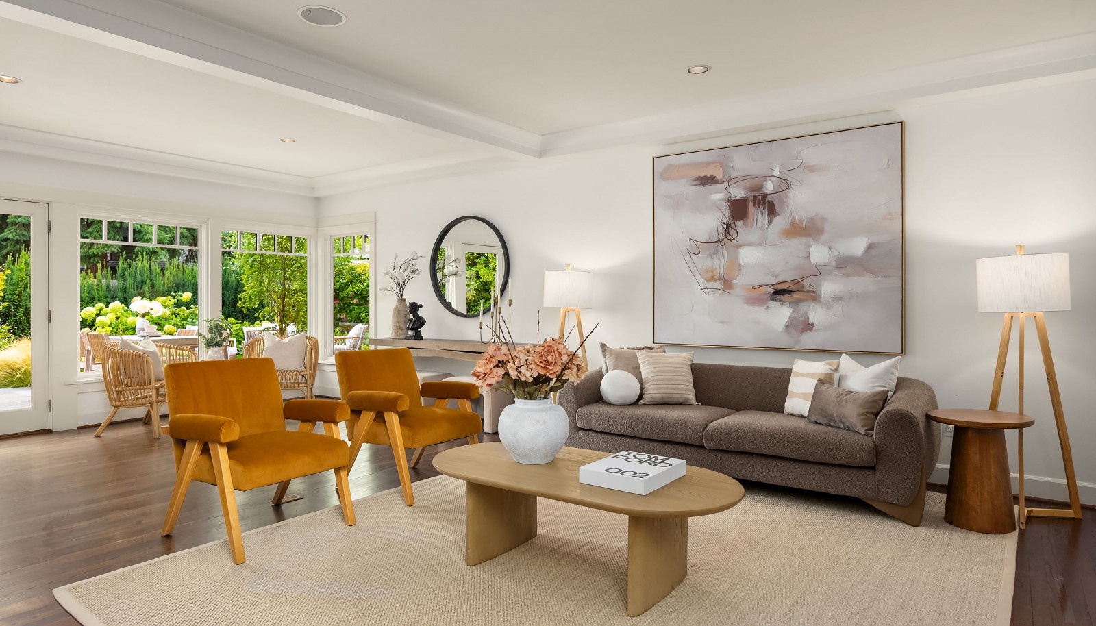A close up looking out to the garden and patio from the living room.